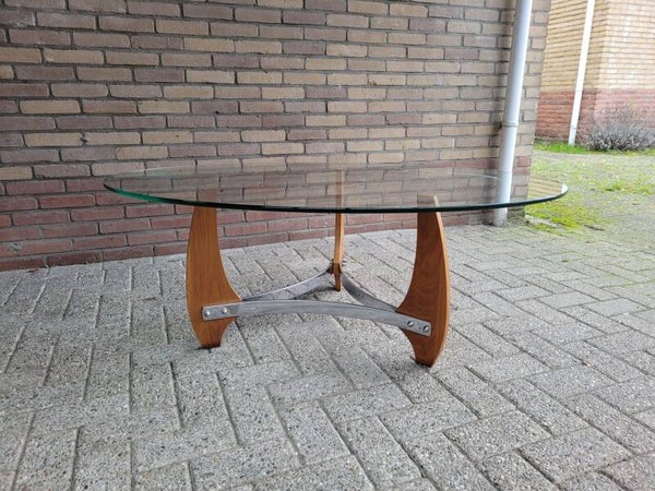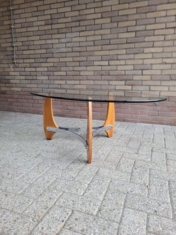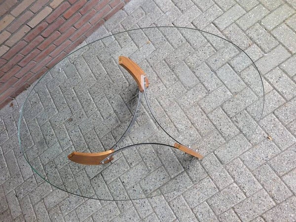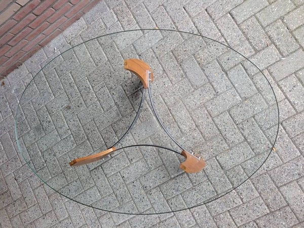 Hoogwaardig frame van notenhoutfineer en roestvrij staal met een glazen tafelblad.